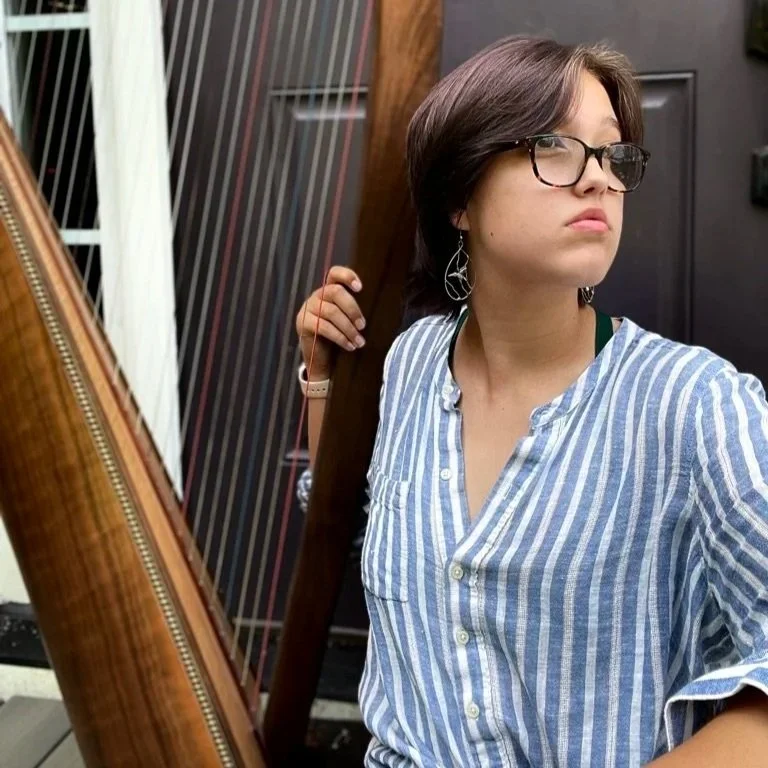 Eleanor is an acclaimed 18-year-old harper and composer who has been studying under renowned New England harpist Dominique Dodge since the age of 12. Known for their consistent and authentic performances, Eleanor toured with the Young Tradition Vermont Touring Group and served as the Principal Harpist for the Vermont Youth Orchestra. They are currently collaborating with local musicians to create unique sounds by blending different traditions and styles. Eleanor is also a passionate educator, providing personalized instruction to students of all levels, and helps with harp maintenance, repairs, and other harp-related work at the Vermont Harp Center.